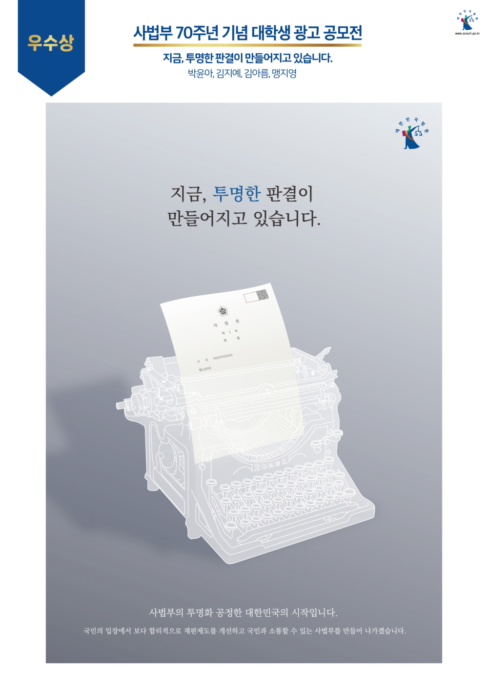 ¢ºÀÛǰ Á¦¸ñ: Áö±Ý, Åõ¸íÇÑ ÆÇ°áÀÌ ¸¸µé¾îÁö°í ÀÖ½À´Ï´Ù. ¢ºÀÛǰ ¼³¸í: Åõ¸íÇÑ Å¸ÀÚ±â·Î ÀÛ¼ºµÇ´Â ÆÇ°á¹®À» ÅëÇØ ±¹¹Î¿¡°Ô ÆÇ°á°ú ±â·ÏÀ» Åõ¸íÇÏ°Ô °ø°³ÇÏ´Â ¹ÏÀ» ¼ö ÀÖ´Â »ç¹ýºÎÀÇ À̹ÌÁö¸¦ Ç¥ÇöÇß½À´Ï´Ù. ½½·Î°ÇÀÇ ÅØ½ºÆ®¿¡¼´Â Åõ¸íÇÔÀ̶ó´Â ´Ü¾î¸¦ °Á¶ÇÏ¿© °øÁ¤ÇÑ ´ëÇѹα¹À» ¸¸µé¾î ³ª°¡´Â »ç¹ýºÎÀÇ À̹ÌÁö¸¦ ´ã¾Ò½À´Ï´Ù.