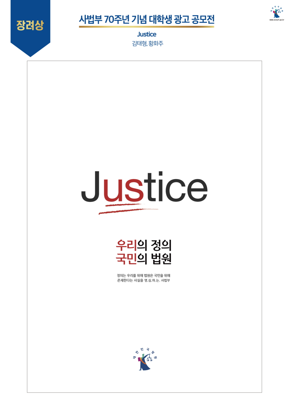 ¢ºÀÛǰ Á¦¸ñ: Justice ¢ºÀÛǰ ¼³¸í: Á¤ÀÇ Justice¿¡¼ "us" Áï ¿ì¸®¶ó´Â ´Ü¾î¸¸À» µû·Î °Á¶ÇÏ¿© ¿ì¸®ÀÇ Á¤ÀÇ ±¹¹ÎÀÇ »ç¹ýºÎ¶ó´Â °ÍÀ» Ç¥ÇöÇÏ¿´½À´Ï´Ù.